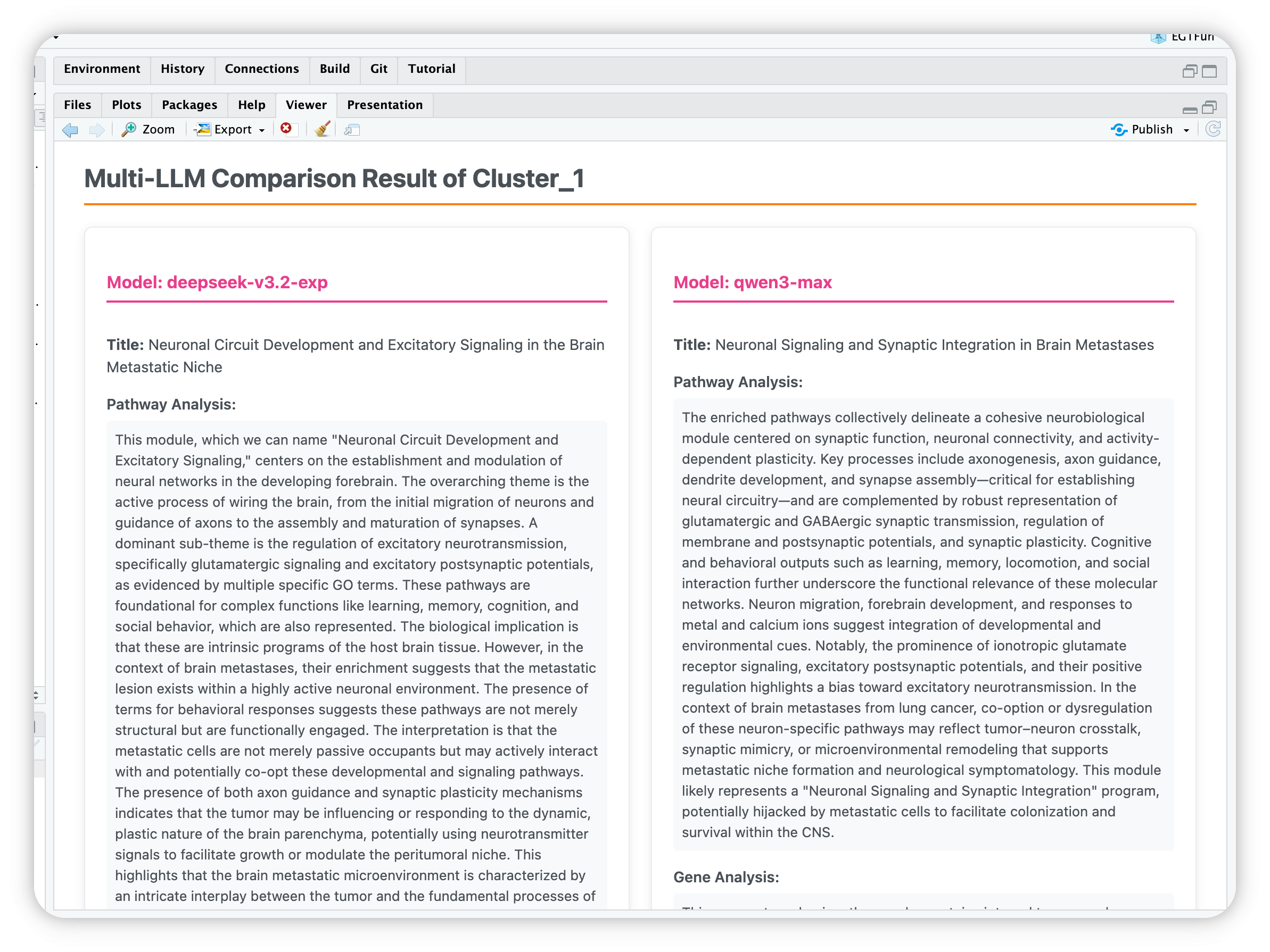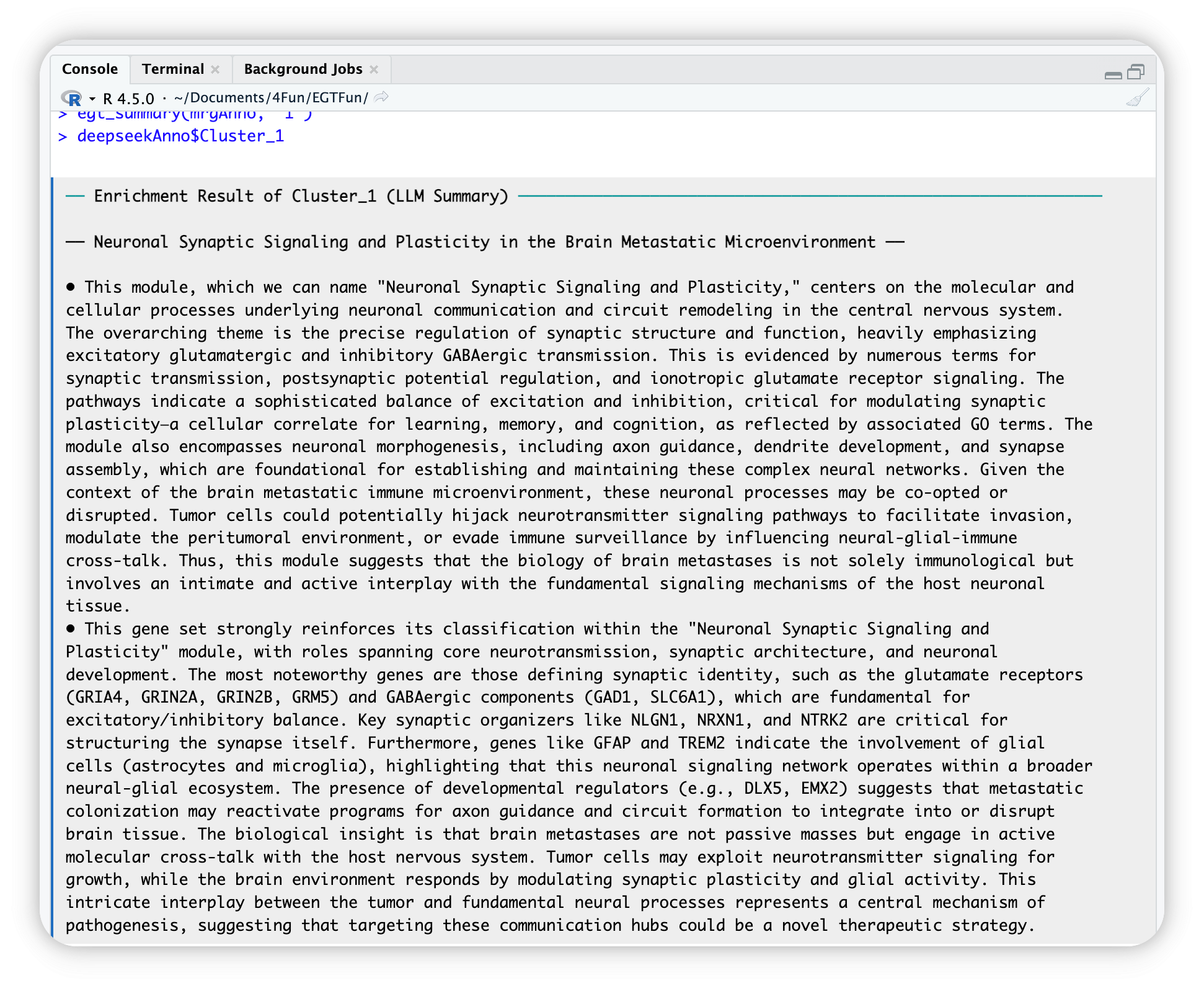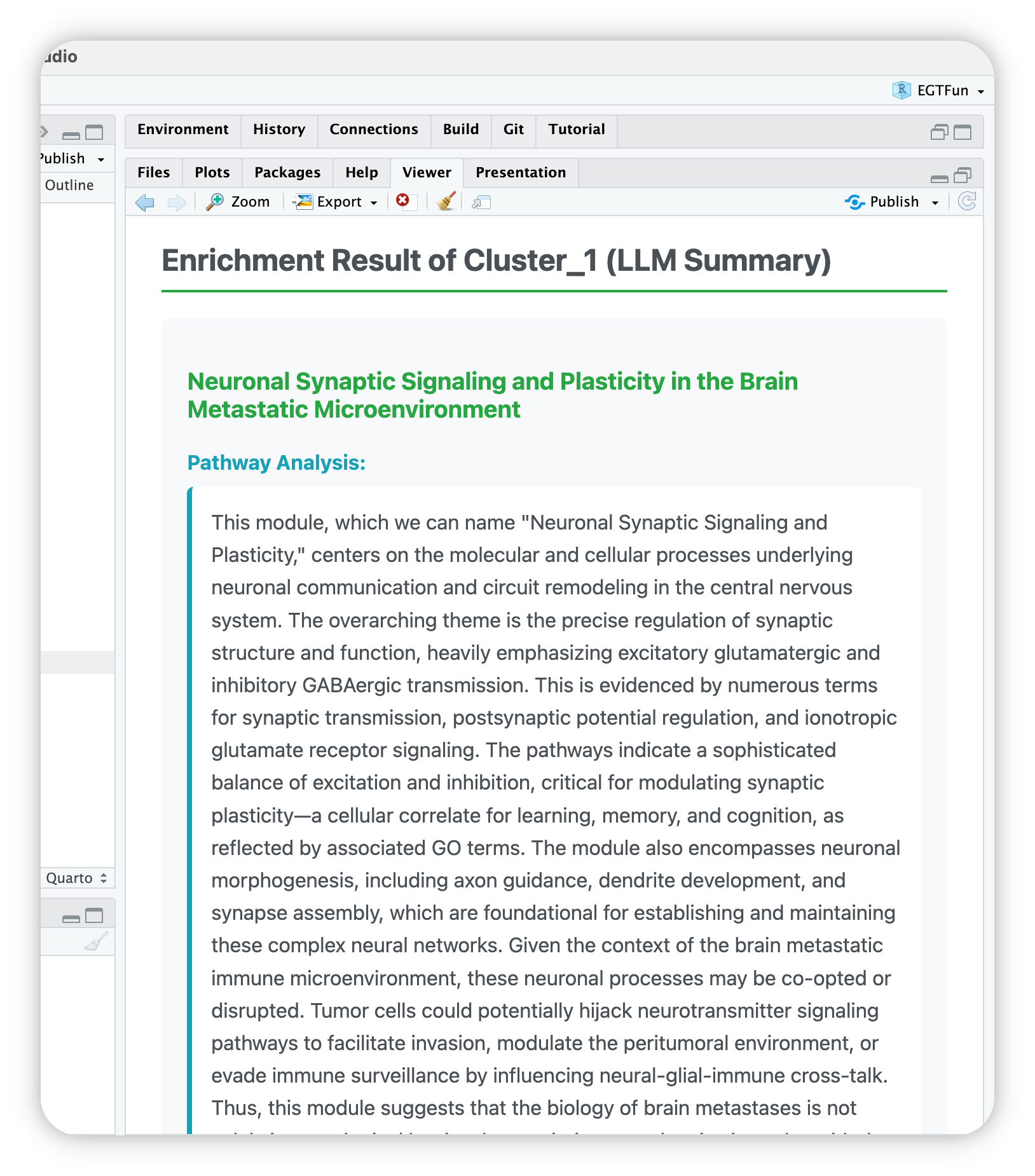 EnrichGT works well with IDEs RStudio and Positron. You can use egt_summary() function to see the LLM summaries.